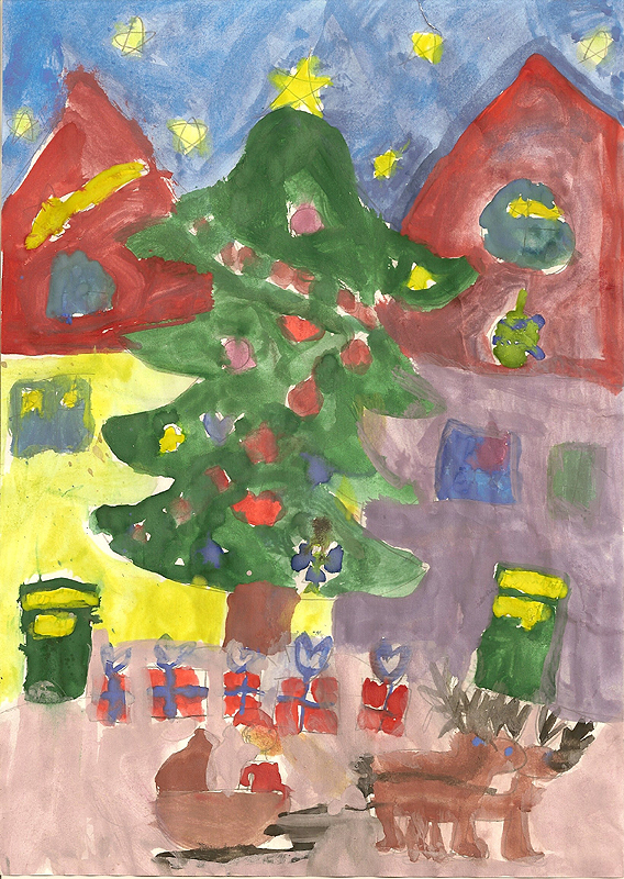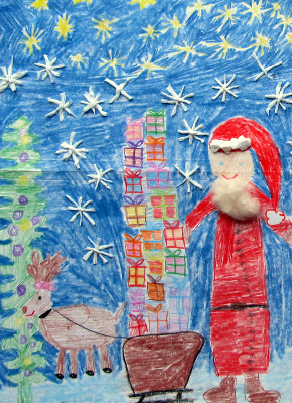 Droga Natalko, jak Ty tak pięknie rysujesz w wieku 5 lat, to co będzie za 10 czy 20? Widać, że dużo czasu spędziłaś rysując tak dokładnie ten cały stos prezentów. Podoba nam się też to, że oprócz rysowania jest też wyklejanka. Broda Mikołaja i gwiazdki są urocze.