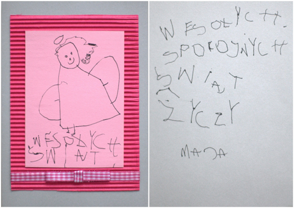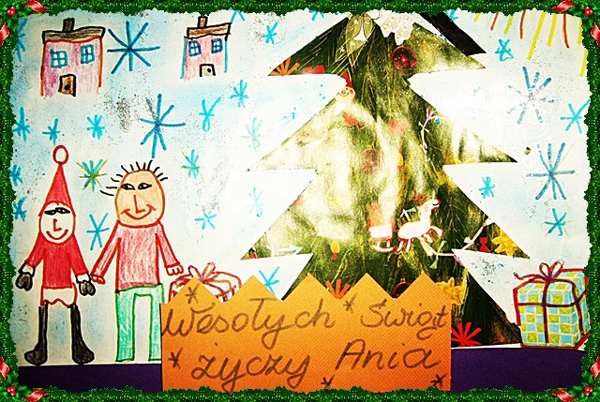 Maju, wspaniałego aniołka narysowałaś i piękne życzenia napisałaś. Bardzo zdolna z ciebie dziewczynka. Rodzicom należą się gratulacje za bardzo ładną oprawę rysunku. Taka kartka świąteczna wzruszy każdego.