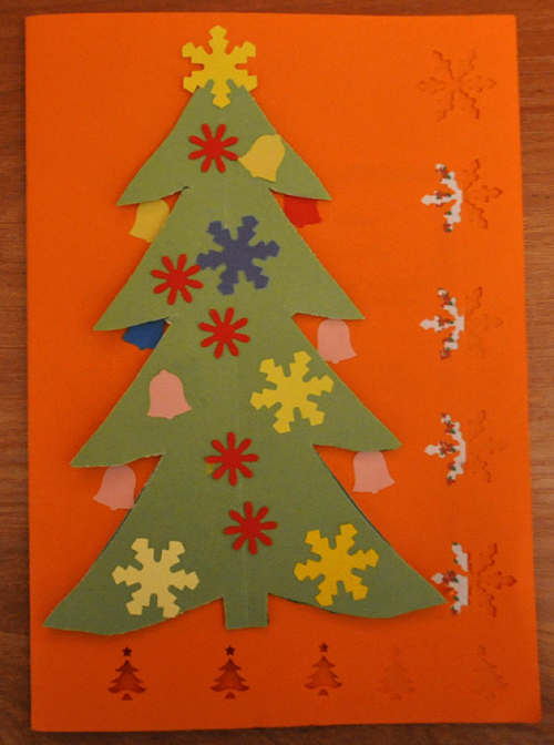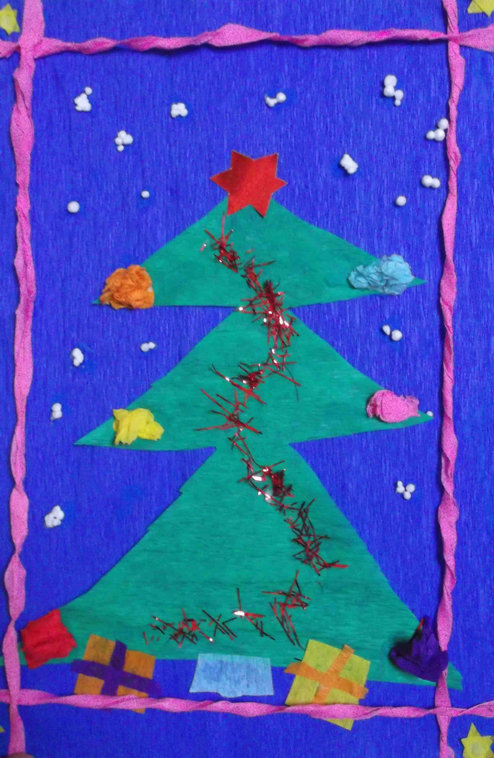 Kinga zrobiła kartkę metodą "wycinanki-naklejanki". Wycięła śliczną choinkę i pięknie ją ozdobiła.