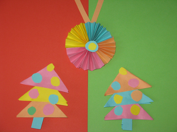Prostą, ale ładną i kolorową pracę otrzymaliśmy od Konrada. Śliczne choineczki i papierowa rozeta.