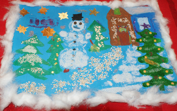 Malwina zrobiła śliczny rysunek wykorzystując różne materiały. Jest tu wata i kasza, ryż i brokat, a do tego farby i złote gwiazdki. Wspaniale to wygląda.